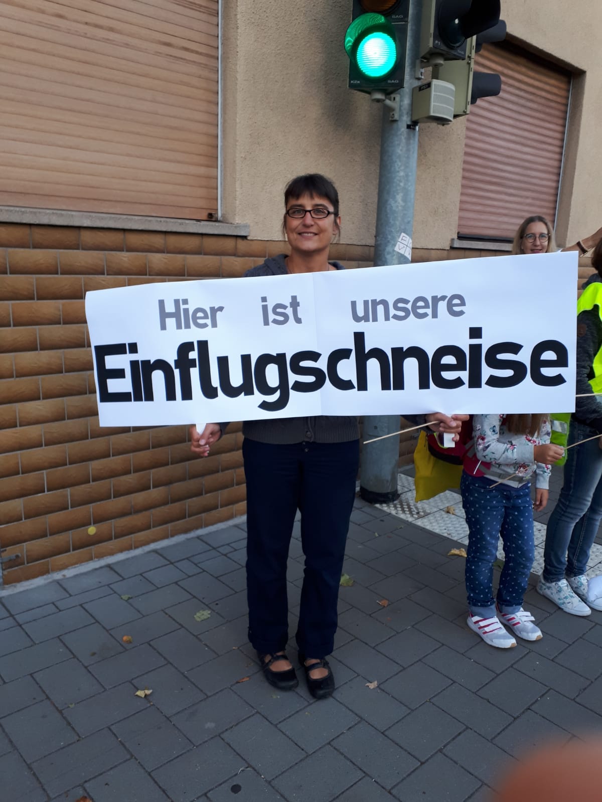 Zum Schulanfang fand eine Aktion mit Flugzeugen und Hinweisschild auf die „Einflugschneise“ der Schulkinder über die Bundesstraße statt. Schwebende Flugzeuge brachten die Autofahrer dazu sich bewusster der Ampelanlage zu nähern…